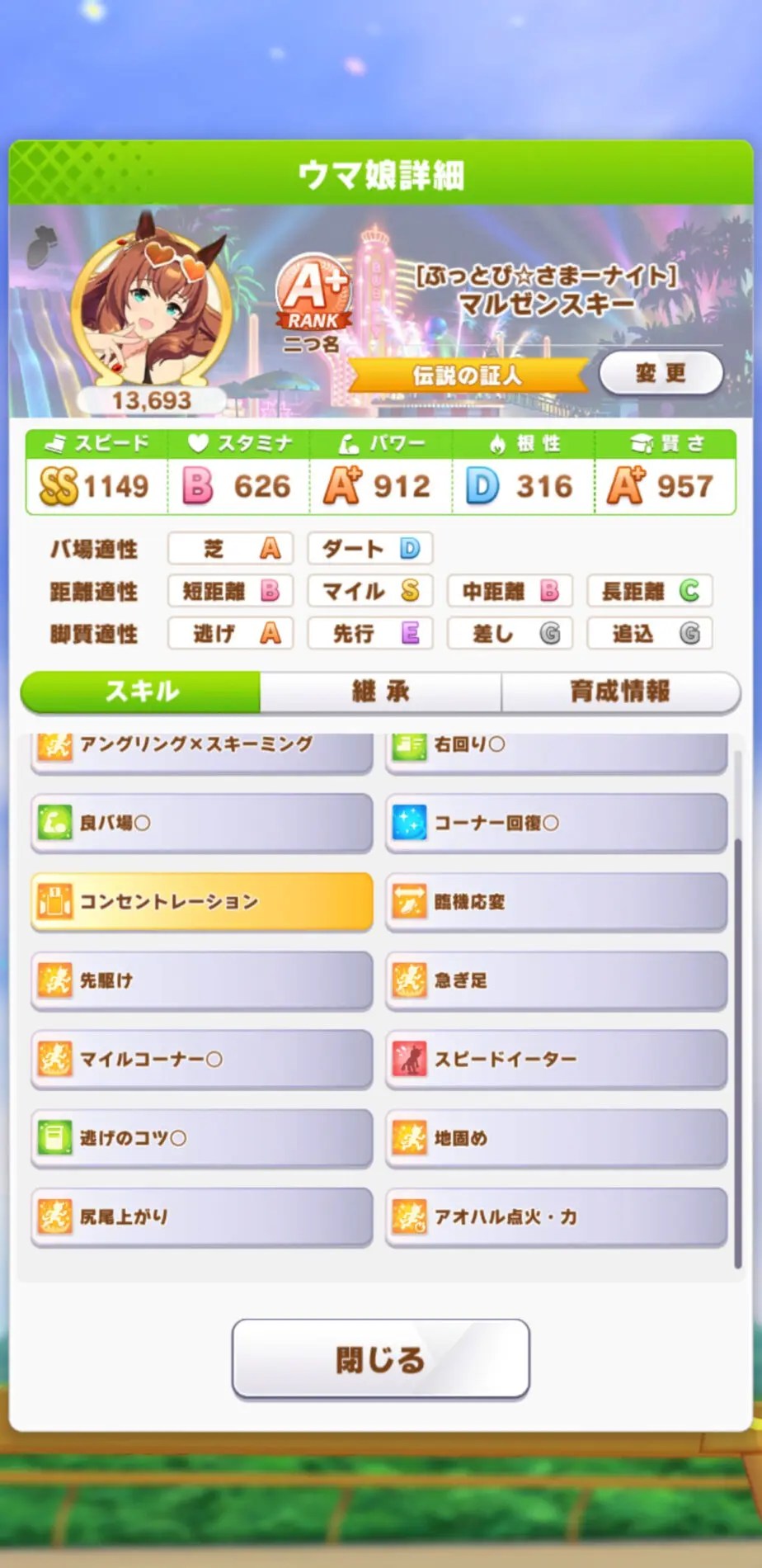 - 地固めマイル適性継承ガチャ勝利、おまけにノーマルおば固有まで引っ張ってきたけど、ステとスキルがやや不足気味