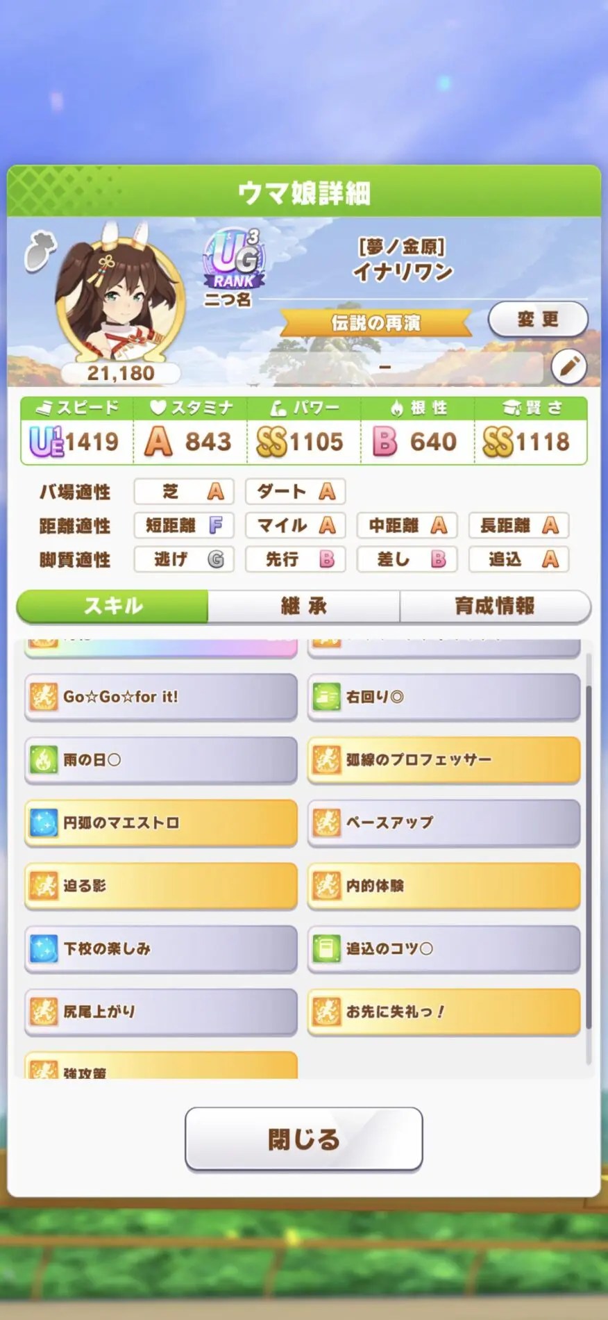 すまん神イナリの育成疲れたからもう距離S直線コーナー無いけど妥協してええか😭